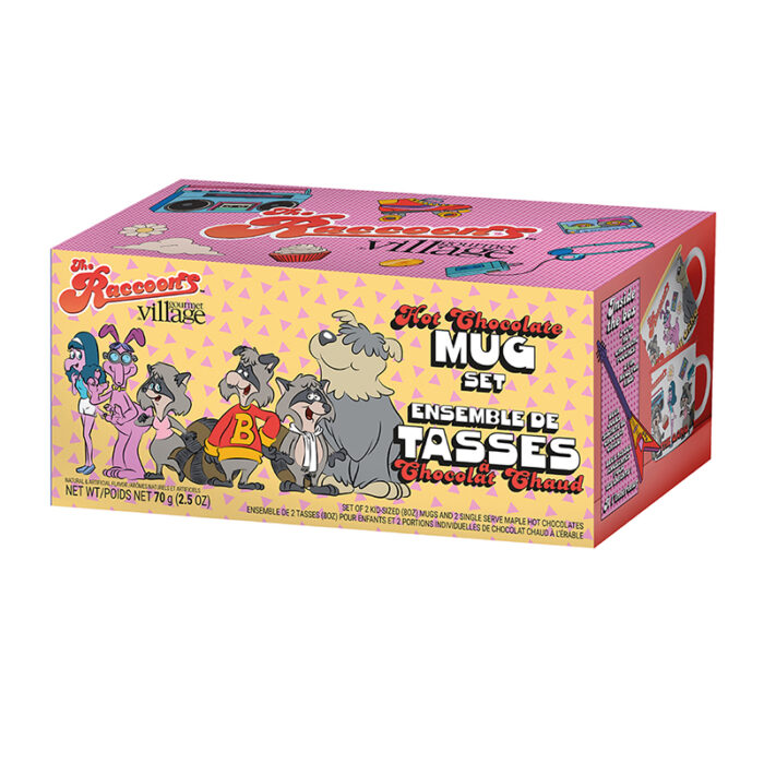 Each gift set includes 2 kid sized ceramic mugs, 250ml (8oz) capacity decorated with The Raccoons Gang characters featured on our Maple Chocolate minis. Inside this gift box you will find 2 single serve maple pouches hot chocolates to go with the 2 mugs.